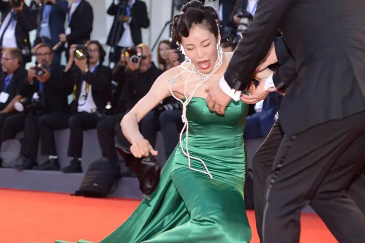 Wir sind uns nicht ganz sicher, warum noch keine beweglichen Gehwege wie wir sie am Flughafen sehen, auf dem roten Teppich installiert wurden. Schauspielerin Liang Jingke blieb mit ihrem wunderschönen smaragdgrünen Kleid beim Filmfestival von Venedig 2016 hängen, und im Kampf Frau gegen Kleid sieht es so aus, als hätte das Kleid gewonnen.