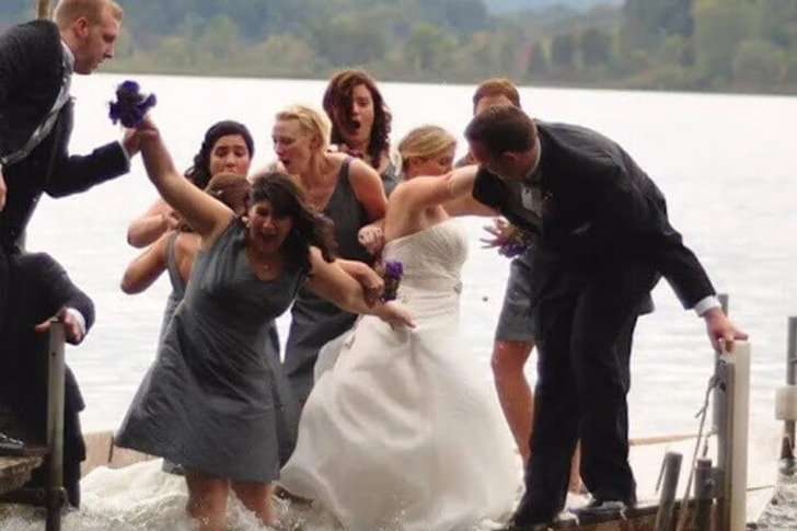 Wer möchte kein schönes Hochzeitsfoto in der Natur, mit einem friedlichen See im Hintergrund und üppigem Grün? Das ist so ziemlich der Traum von jedem, und diese Leute haben versucht, ihn wahr werden zu lassen. Leider nahmen die Dinge eine schlechte Wendung, als sie viele Menschen auf eine kleine Plattform drängten, um ein süßes und idyllisches Hochzeitsfoto zu bekommen. Sie haben nicht bedacht, dass die große Gruppe für die kleine Plattform viel zu viel wäre.