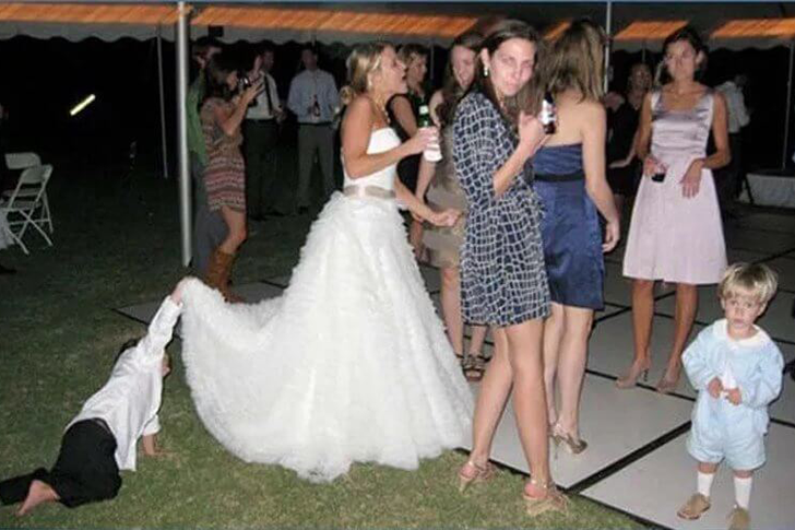 Die Leute bei dieser Gartenhochzeit scheinen alle eine gute Zeit zu haben, vielleicht sogar zu gut; tatsächlich sind sie ziemlich ahnungslos in Bezug auf die offensichtlichste Sache auf diesem Bild. Der junge Junge schaut heimlich nach, um herauszufinden, was unter diesem Kleid vor sich geht, und die Braut wäre nicht gerade erfreut, wenn sie davon wüsste, was zweifellos komisch ist.