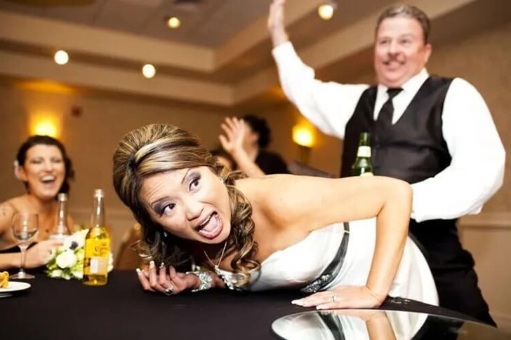 Dieses Paar hat die Unterhaltung der Gäste auf ihrer Hochzeit auf die Spitze getrieben. Es ist unangenehm anzusehen, aber es scheint erfolgreich gewesen zu sein, wie die lachenden Gesichter im Hintergrund zeigen.
