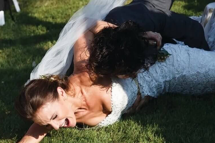 Wir können nicht wirklich herausfinden, was auf diesem Foto passiert. Zuerst sieht es aus, als würden sie vielleicht Football nach der Hochzeit spielen, bis man die Stühle sieht und realisiert, dass dies während der Zeremonie passiert ist. Da die Braut auf dem Boden liegt, ist möglicherweise jemand über sie gestolpert, als sie den Gang entlang ging. Nur eine leichte und vorübergehend schmerzhafte Verzögerung, um ihren Bräutigam auf der anderen Seite zu erreichen.