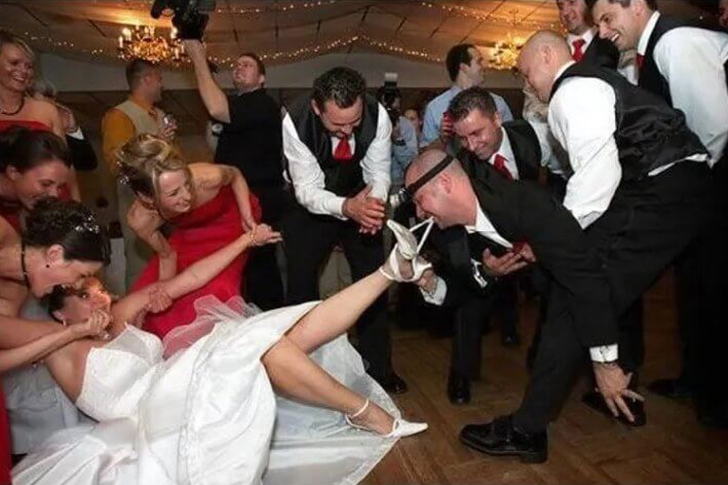 So unangenehm es auch ist, dieses Bild anzusehen, das der Bräutigam das Strumpfband der Braut mit den Zähnen abnimmt, ist leider eine sehr verbreitete Aktivität bei Hochzeiten – ob wir es wollen oder nicht. Offensichtlich hatten sie so eine gute Zeit, dass die Braut nach hinten fiel und von ihren zuverlässigen Brautjungfern aufgefangen wurde, die sie vor einer möglicherweise schweren Verletzung bewahrt haben könnten.